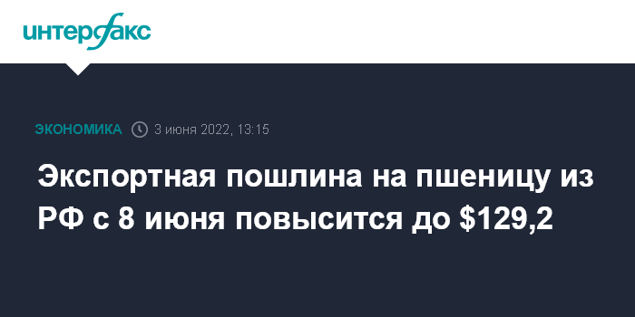 Москва. 3 июня. INTERFAX.RU - Экспортная пошлина на пшеницу из РФ с 8 июня повысится до $129,2 со $121,2 за тонну, сообщает Минсельхоз.