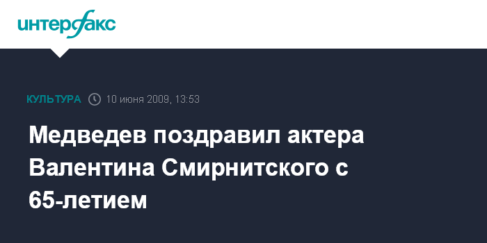 Москва. 10 июня. INTERFAX.RU - Президент России Дмитрий Медведев поздравил актера театра и кино, народного артиста РФ Валентина Смирнитского с 65-летием, сообщает в среду пресс-служба Кремля.