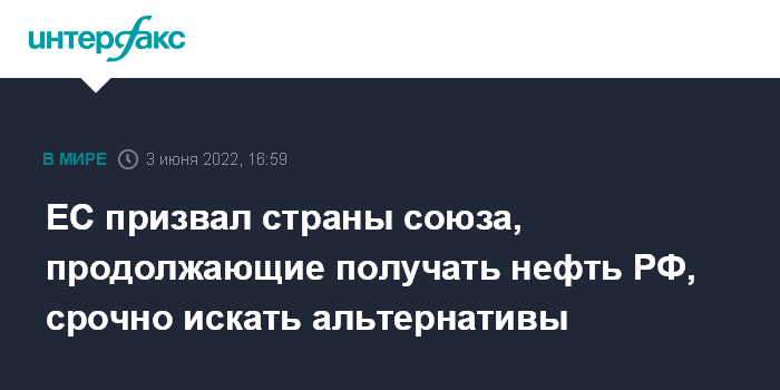 Москва. 3 июня. INTERFAX.RU - Странам ЕС, которые получили возможность, несмотря на европейские санкции, продолжить импортировать нефть из России, следует быстро искать альтернативных поставщиков, говорится в пояснениях к шестому пакету санкций, опубликованных в пятницу в Официальном журнале ЕС.