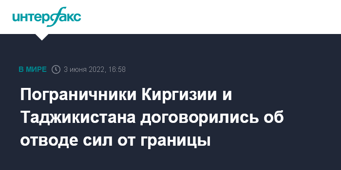 Москва. 3 июня. INTERFAX.RU - Киргизия и Таджикистан договорились отвести от границы в пункты дисклокации силы и средства, демонтировать инженерные сооружения, сообщает Погранслужба Киргизии по итогам переговоров.