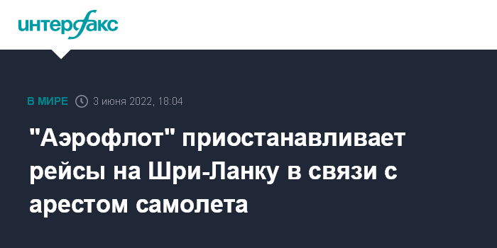 Рейс был отменен "в связи с отсутствием разрешения авиационных властей Шри-Ланки", пояснили в пресс-службе "Аэрофлота". Судебное слушание о снятии ареста с воздушного судна назначено на 8 июня. Пассажиры рейса размещены в гостинице и "будут проинформированы контакт-центром "Аэрофлота" о времени вылета в Москву".