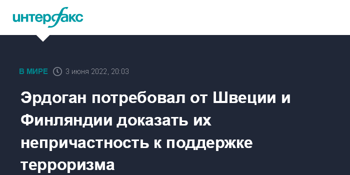 Москва. 3 июня. INTERFAX.RU - Швеции и Финляндии следует доказать, что они не поддерживают терроризм, если эти страны хотят, чтобы Анкара поддержала их заявку на членство в НАТО, заявил президент Турции Реджеп Тайип Эрдоган в пятницу генсеку Североатлантического альянса Йенсу Столтенбергу.