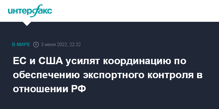 Москва. 3 июня. INTERFAX.RU - На встрече в Брюсселе высокопоставленные официальные лица из США и ЕС договорились усилить координацию по обеспечению мер по экспортному контролю в отношении России, сообщили в пятницу в Еврокомиссии.