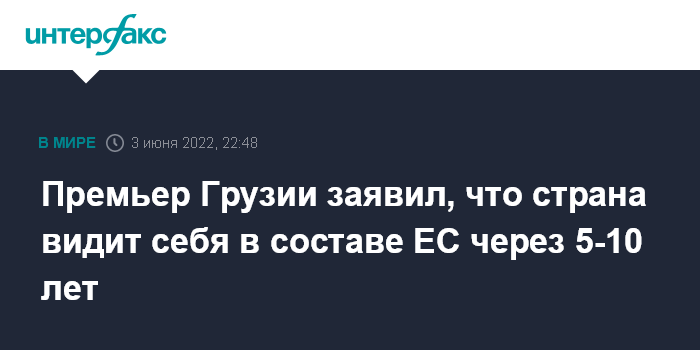 Москва. 3 июня. INTERFAX.RU - Грузия осуществит реформы и трансформируется в настоящее европейское государство, что позволит ей вступить в Евросоюз через 5-10 лет, заявил глава грузинского правительства Ираклий Гарибашвили в пятницу на Форуме глобальной безопасности (GLOBSEC 2022) в Братиславе.
