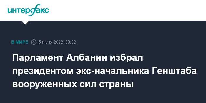 Москва. 4 июня. INTERFAX.RU - Парламент Албании в субботу избрал президентом страны бывшего начальника Генштаба албанских вооруженных сил Байрама Бегая, пишет издание Albanian Daily News.