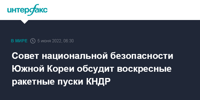 Москва. 5 июня. INTERFAX.RU - Совет национальной безопасности (СНБ) Южной Кореи обсудит в воскресенье последние ракетные пуски Северной Кореи, сообщают южнокорейские СМИ со ссылками на администрацию южнокорейского президента.