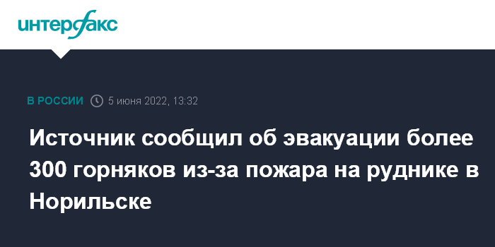 Источник сообщил об эвакуации более 300 горняков из-за пожара на руднике в Норильске