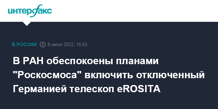 4 июня Рогозин заявил, что дал указание восстановить работу немецкого телескопа eROSITA, входящего в состав российско-немецкой орбитальной обсерватории "Спектр-РГ. "Мы исправим ошибку немцев и включим их телескоп на нашей обсерватории "Спектр-РГ"", - заявил он.