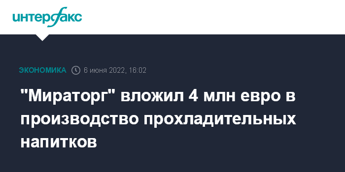 Москва. 6 июня. INTERFAX.RU - Агрохолдинг "Мираторг" инвестировал около 4 млн евро в линии по выпуску прохладительных напитков в порядке импортозамещения и собирается производить холодные чаи и лимонады, сообщили "Интерфаксу" в пресс-службе компании.