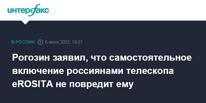 4 июня Рогозин заявил, что дал указание восстановить работу немецкого телескопа eROSITA, входящего в состав российско-немецкой орбитальной обсерватории "Спектр-РГ. "Мы исправим ошибку немцев и включим их телескоп на нашей обсерватории "Спектр-РГ"", - заявил он.