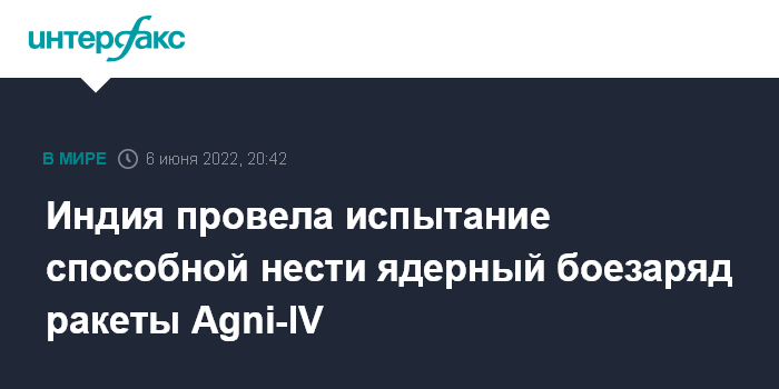Москва. 6 июня. INTERFAX.RU - Индия в понедельник провела успешное испытание баллистической ракеты среднего радиуса действия Agni-IV, способной нести ядерный боезаряд, сообщило Минобороны страны.