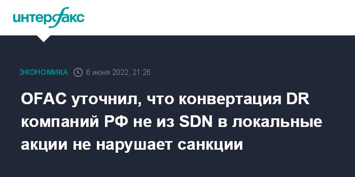 OFAC уточнил, что конвертация DR компаний РФ не из SDN в локальные акции не нарушает санкции