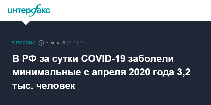 Москва. 7 июня. INTERFAX.RU - Суточный прирост новых заболевших коронавирусом в России составил почти 3,2 тысячи случаев, что стало минимальным значением с середины апреля 2020 года, госпитализированы за сутки почти 1,9 тысячи человек, скончались 73 пациента с COVID-19, следует из данных оперативного штаба, обнародованных во вторник.