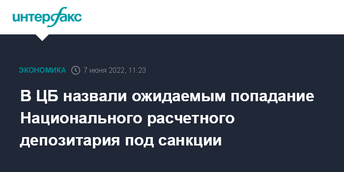Москва. 7 июня. INTERFAX.RU - Внесение Национального расчетного депозитария (НРД) в санкционный список ЕС был ожидаемым, сообщила директор департамента инфраструктуры финансового рынка Банка России Лариса Селютина.