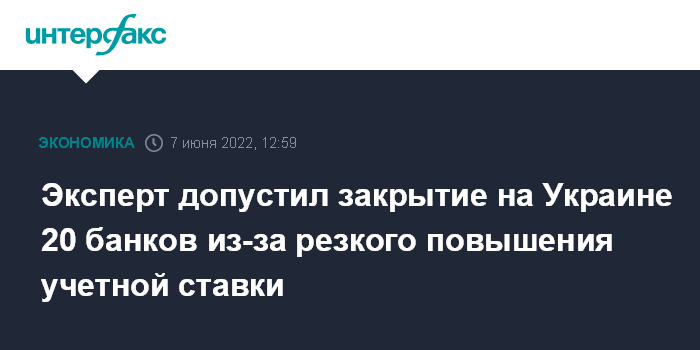 Москва. 7 июня. INTERFAX.RU - Повышение Национальным банком Украины (НБУ) учетной ставки на 15 п.п. – до 25% приведет к закрытию более 20 банков и навредит финансовой стабильности Украины.