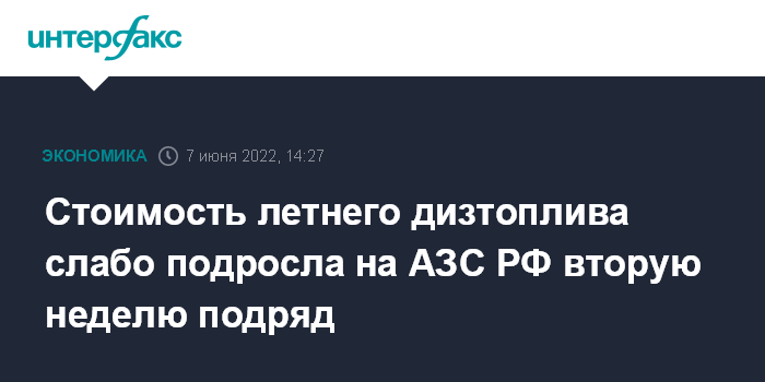 Москва. 7 июня. INTERFAX.RU - Стоимость летнего дизельного топлива продолжала слабо расти на АЗС РФ вторую неделю подряд – с 26 мая по 2 июня, свидетельствуют данные ЦДУ ТЭК.
