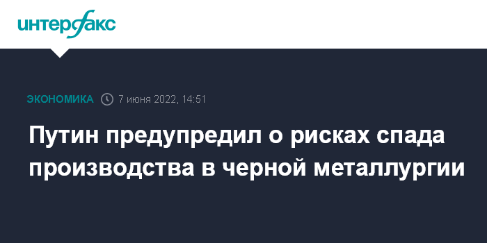 Москва. 7 июня. INTERFAX.RU - Ряд отраслей, в том числе черная металлургия, "сигнализирует о рисках существенного снижения производства в среднесрочной перспективе", заявил на совещании по экономике президент Владимир Путин.