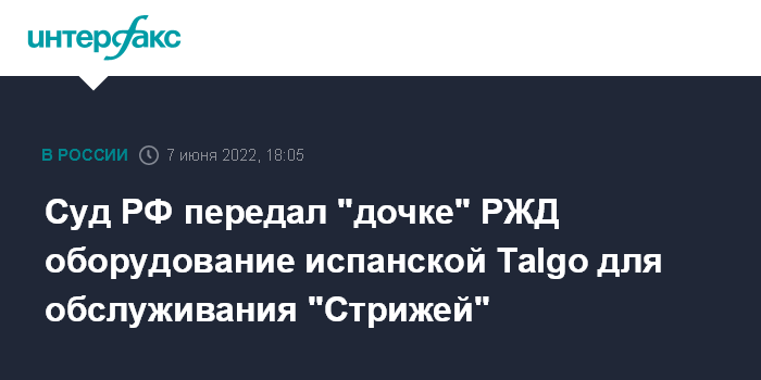 Москва. 7 июня. INTERFAX.RU - Арбитражный суд Москвы признал законной передачу оборудования и запчастей испанской Patentes Talgo пассажирской "дочке" РЖД (АО "ФПК"), эксплуатирующей поезда "Стриж", сформированные из вагонов испанской компании.