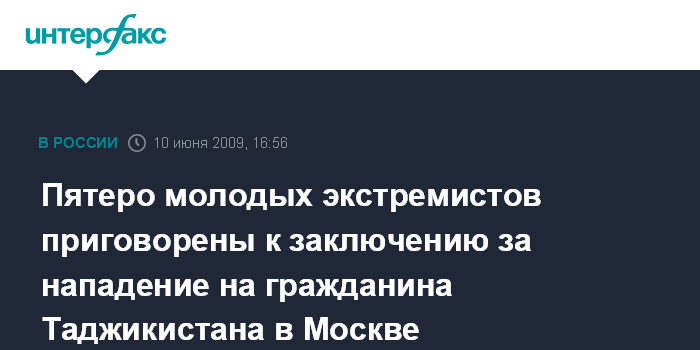 Москва. 10 июня. INTERFAX.RU - Группа активистов молодежной экстремистской организации, в том числе несовершеннолетние, приговорены к заключению за нападение в Москве на гастарбайтера из Таджикистана по мотивам национальной ненависти.