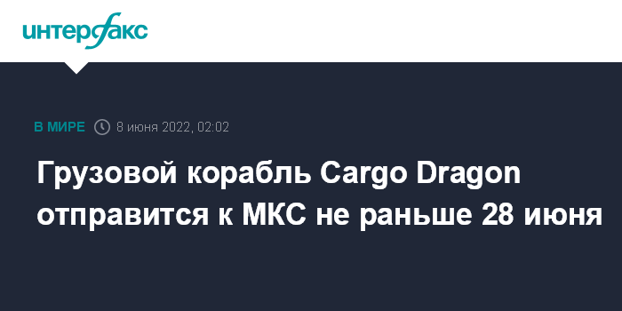 Москва. 8 июня. INTERFAX.RU - Грузовой космический корабль компании SpaceX Cargo Dragon отправится к Международной космической станции (МКС) не ранее 28 июня из-за ранее выявленных проблем в двигательной системе, сообщило Национальное управление США по аэронавтике и исследованию космического пространства (NASA).