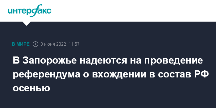 Москва. 8 июня. INTERFAX.RU - Запорожская область Украины примет решения для скорейшего проведения референдума о вхождении в состав РФ, сообщил глава временной военно-гражданской администрации (ВГА) Запорожья Евгений Балицкий.