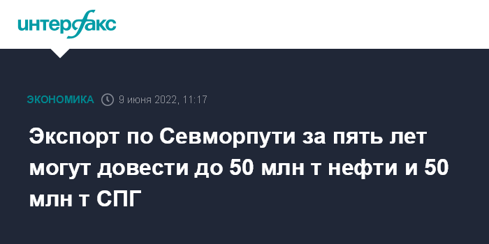 Москва. 9 июня. INTERFAX.RU - Россия через пять лет будет вывозить на экспорт по Северному морскому пути (СМП) 100 млн тонн нефти и сжиженного природного газа (СПГ), для этого нужно строить необходимую инфраструктуру, сообщил на Дальневосточном медиасаммите министр по развитию Дальнего Востока и Арктики Алексей Чекунков.