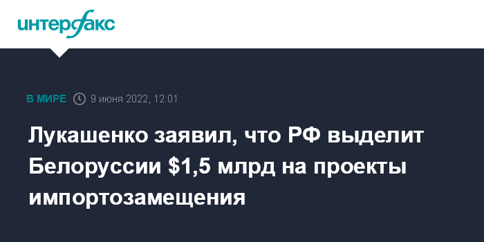 Москва. 9 июня. INTERFAX.RU - Белоруссия получит от России финансовую поддержку в объеме $1,5 млрд для участия в программах импортозамещения, заявил белорусский президент Александр Лукашенко.