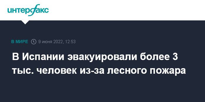 Москва. 9 июня. INTERFAX.RU - В Испании в связи с бушующим на юге лесным пожаром эвакуировали около 3 тыс. человек, на борьбу с ним брошены почти 1 тыс. пожарных, сообщили в четверг западные СМИ.
