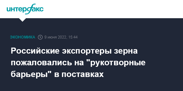 Москва. 9 июня. INTERFAX.RU - Россия не сможет выбрать квоту на экспорт зерна в этом сезоне из-за "рукотворных барьеров" в поставках, заявил для поставок, заявил на площадке клуба "Валдай" председатель правления Союза экспортеров зерна Эдуард Зернин.