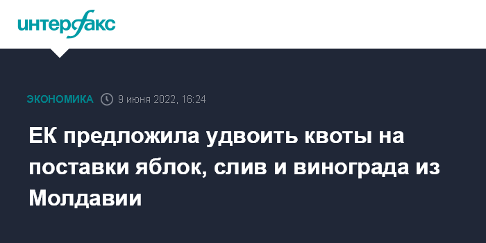 Москва. 9 июня. INTERFAX.RU - Европейская комиссия предложила временно удвоить квоты на яблоки, сливы, столовый виноград и другую сельхозпродукцию из Молдавии в связи с потерей этой страной рынка сбыта продукции из-за событий на Украине, сообщила пресс-служба ЕК.