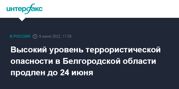 Москва. 9 июня. INTERFAX.RU - Губернатор Белгородской области Вячеслав Гладков сообщил о продлении действующего в регионе "желтого" уровня террористической опасности еще на две недели.
