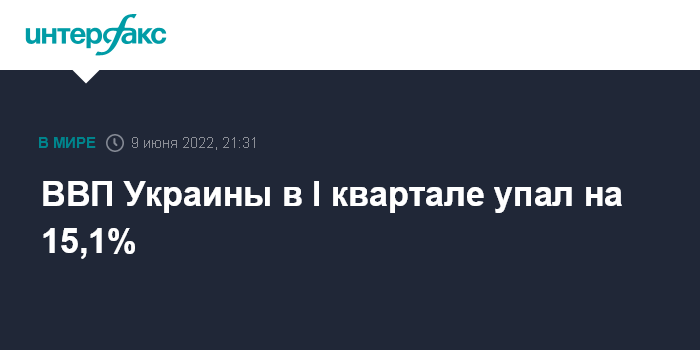 Москва. 9 июня. INTERFAX.RU - Реальный валовой внутренний продукт (ВВП) Украины в первом квартале 2022 года сократился на 15,1% по сравнению с аналогичным периодом прошлого года после роста на 6,1% в четвертом квартале 2021 года. Об этом сообщила Государственная служба статистики в четверг со ссылкой на предварительные данные.