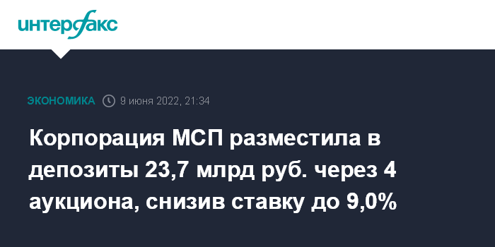 Москва. 9 июня. INTERFAX.RU - АО "Федеральная корпорация по развитию малого и среднего предпринимательства" ("Корпорация "МСП") 7 и 8 июня разместило в депозиты 23,7 млрд рублей, для чего последовательно пришлось проводить на "Мосбирже" четыре аукциона, снизить срок депозита до месяца, ставку размещения с 10% до 9%.
