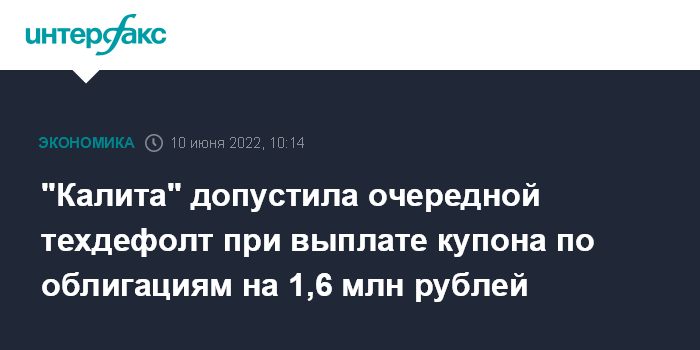 "Калита" допустила очередной техдефолт при выплате купона по облигациям на 1,6 млн рублей