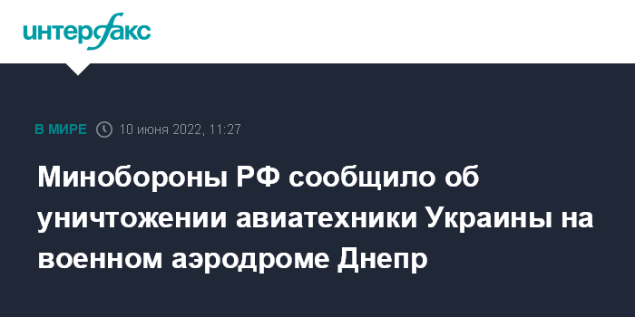 Москва. 10 июня. INTERFAX.RU - Российская авиация высокоточными ракетами уничтожила авиатехнику Украины на военном аэродроме Днепр, сообщил официальный представитель Минобороны РФ Игорь Конашенков.