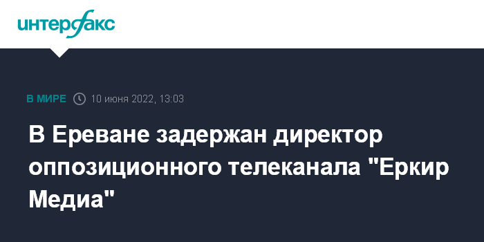 Москва. 10 июня. INTERFAX.RU - Армянский оппозиционный телеканал "Еркир Медиа" сообщил, что его директор Баграт Есаян задержан в своем кабинете в Ереване.