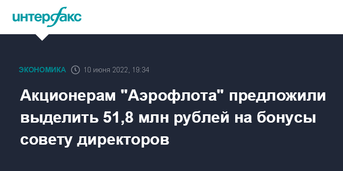 Москва. 10 июня. INTERFAX.RU - Акционеры "Аэрофлота" на годовом собрании планируют утвердить фиксированное вознаграждение членам совета директоров за 2021-2022 корпоративный год на общую сумму 51,8 млн рублей, говорится в материалах к собранию.