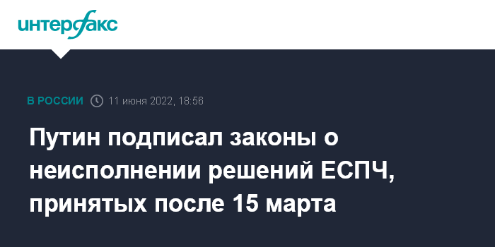 Москва. 11 июня. INTERFAX.RU - Президент РФ Владимир Путин подписал законы об установлении предельного срока исполнения в РФ постановлений ЕСПЧ.