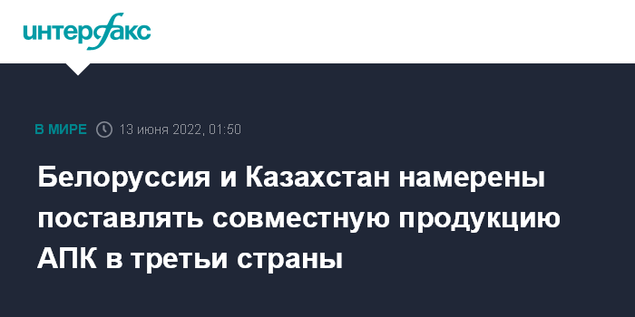 Москва. 13 июня. INTERFAX.RU - Белоруссия и Казахстан планируют поставлять совместную продукцию агропромышленного комплекса в третьи страны, заявил белорусский посол в Нур-Султане Павел Утюпин.