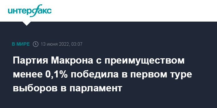 Москва. 13 июня. INTERFAX.RU - Коалиция "Вместе" под руководством президента Франции Эммануэля Макрона набрала 25,65% голосов избирателей в первом туре парламентских выборов, опередив на 0,09% объединение "Новый народный экологический и социальный союз", возглавляемое левым лидером Жан-Люком Меланшоном.
