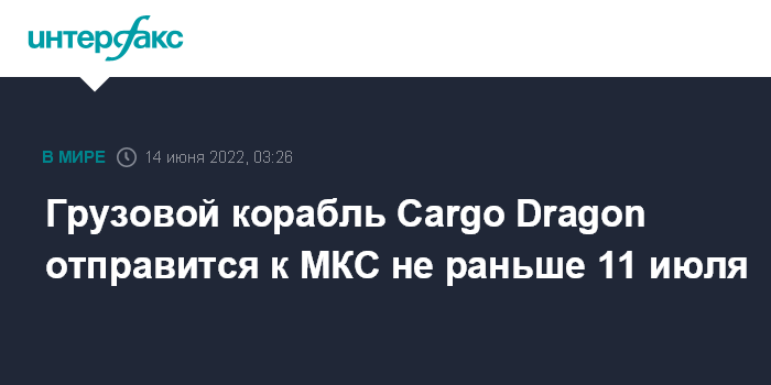 Москва. 14 июня. INTERFAX.RU - Грузовой космический корабль компании SpaceX Cargo Dragon отправится к Международной космической станции (МКС) не ранее 11 июля из-за необходимости замены неисправных деталей в двигательной системе, сообщило Национальное управление США по аэронавтике и исследованию космического пространства (NASA).