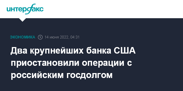 Москва. 14 июня. INTERFAX.RU - Два крупнейших банка США JPMorgan Chase и Goldman Sachs приостановили операции по обслуживанию долговых обязательств РФ, сообщает Bloomberg.