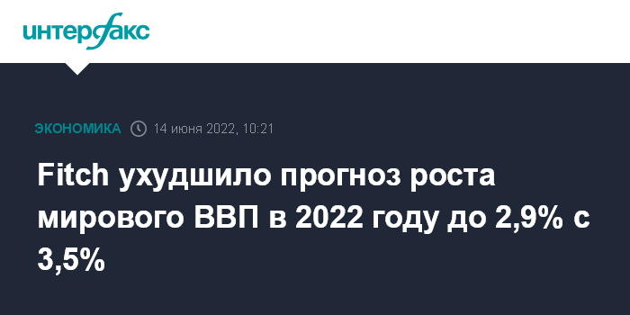 Москва. 14 июня. INTERFAX.RU - Международное рейтинговое агентство Fitch Ratings ухудшило прогноз роста глобальной экономики в 2022 году до 2,9% с ожидавшихся в марте 3,5%, в том числе из-за усиления инфляции.