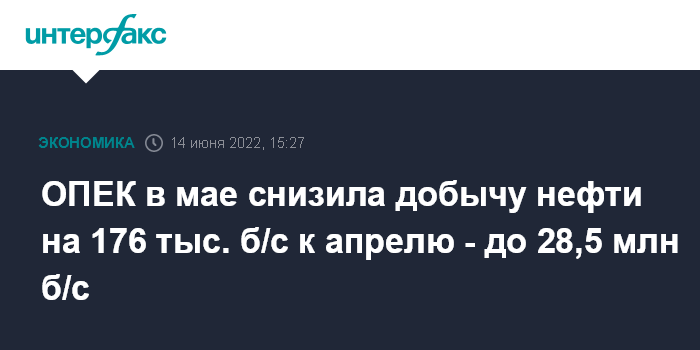 Москва. 14 июня. INTERFAX.RU - Страны ОПЕК в мае снизили добычу нефти на 176 тысяч баррелей в сутки - до 28,5 млн б/с, говорится в ежемесячном отчете организации.