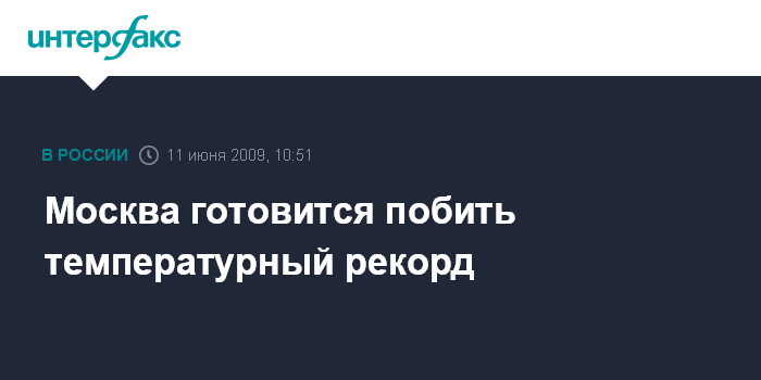 Москва. 11 июня. INTERFAX.RU – В четверг высока вероятность того, что в столице будет побит очередной температурный рекорд. Согласно прогнозам специалистов московского метеобюро, после полудня в городе температура воздуха может подняться до отметки в +32 градуса. Если этот прогноз оправдается, то будет установлен рекорд для данного числа июня: самым теплым пока считается 11 июня 1998 г., когда градусники в столице показывали +31,3 градуса.