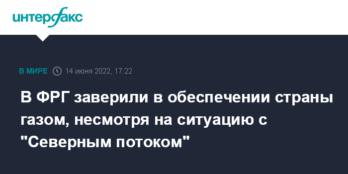 Москва. 14 июня. INTERFAX.RU - Газоснабжение Германии обеспечено, несмотря на заявленное "Газпромом" снижение прокачки по "Северному потоку" на 40%, сообщила во вторник представитель министерства экономики ФРГ.