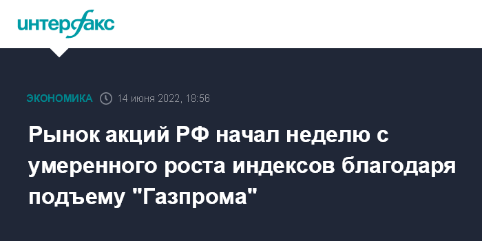 Москва. 14 июня. INTERFAX.RU - Рынок акций РФ начал торговую неделю с умеренного роста индексов за счет подорожавших бумаг "Газпрома" (+2,8%) благодаря спросу в ожидании их высокой дивидендной доходности, динамика основных blue chips оказалась смешанной на фоне разнополярных внешних сигналов. Во "втором эшелоне" раллировали акции "Юнипро" (+21,7%) на ожиданиях продажи компании энергохолдингом Fortum.