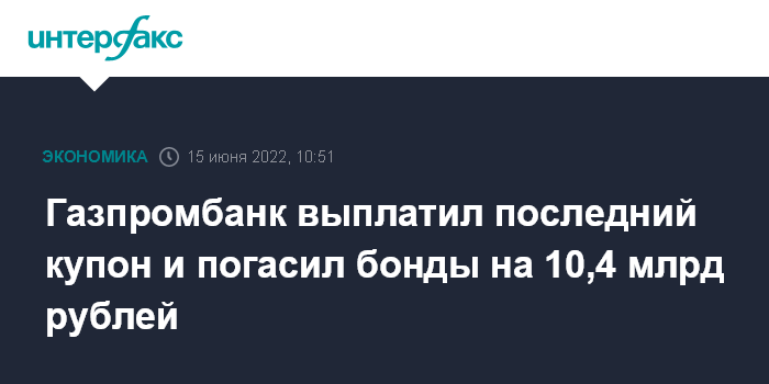 Москва. 15 июня. INTERFAX.RU - Газпромбанк (ГПБ) выплатил 7-й купон по облигациям серии 001Р-03Р на сумму 463,1 млн рублей и погасил выпуск объемом 10,377 млрд рублей, говорится в сообщении кредитной организации.