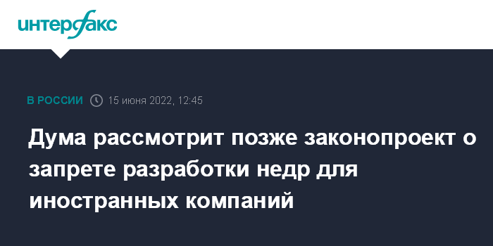Москва. 15 июня. INTERFAX.RU - Госдума на заседании в среду приняла решение перенести на более поздний срок рассмотрение законопроекта, который вводит запрет на выдачу лицензий на разработку недр иностранным компаниям.