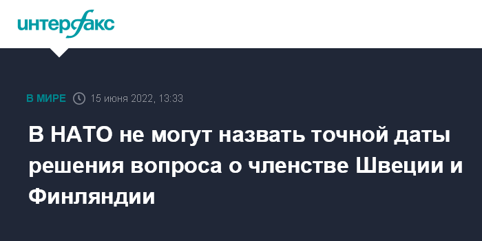 Москва. 15 июня. INTERFAX.RU - Партнеры по НАТО постараются решить вопрос о членстве Швеции и Финляндии как можно быстрее, но точная дата вступления этих стран пока неизвестна, заявил генсек Североатлантического альянса Йенс Столтенберг.